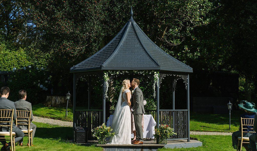 Exclusive-use wedding venue licensed for indoor and outdoor ceremonies up to 150 guests, featuring the Garden Suite, Llechwedd Suite (for intimate weddings), and a charming wedding gazebo.